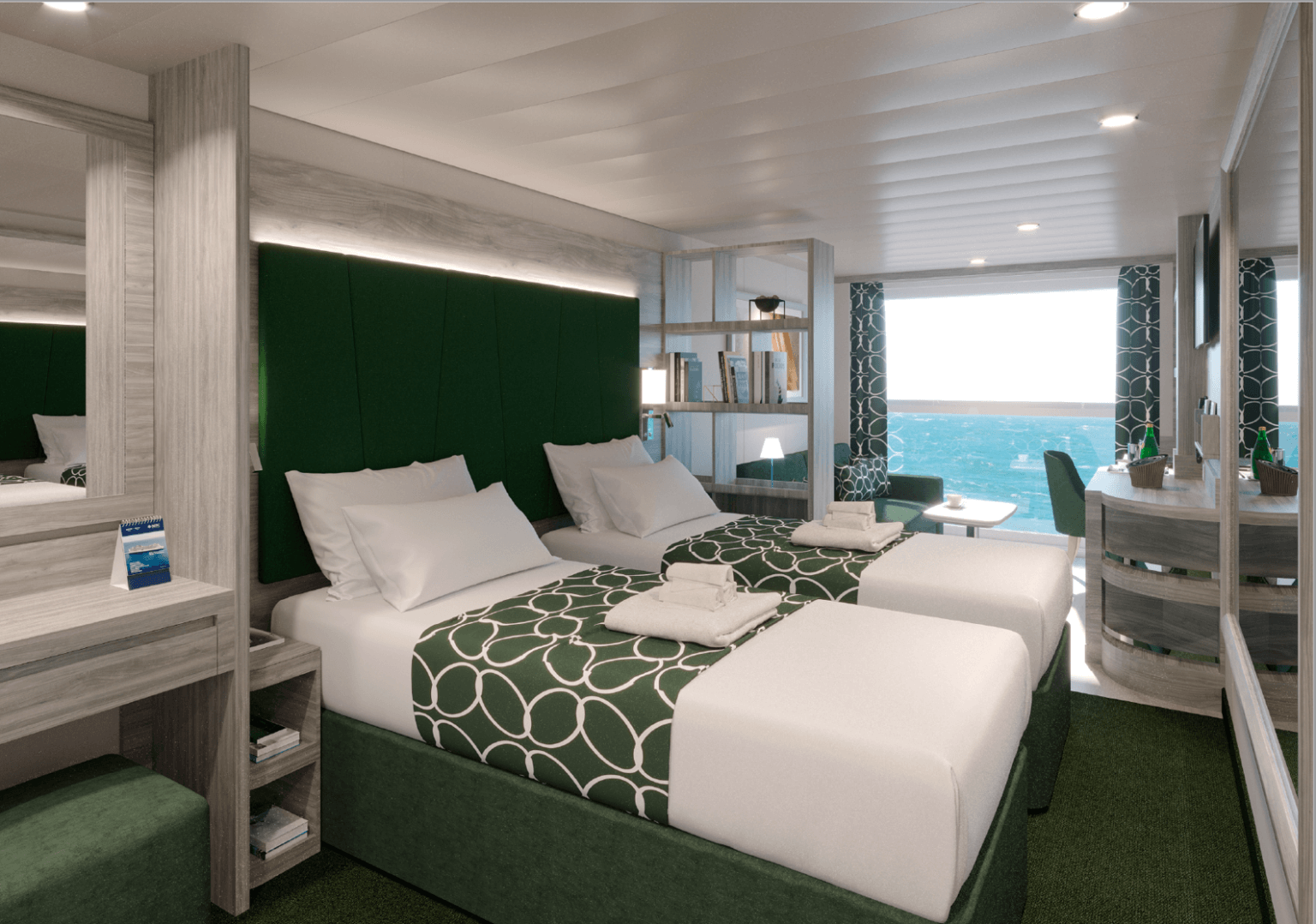 The number of all cabin categories is 34, including the Wellness/Spa grades SEW-Grand Suite, BW-Balcony, OW-Oceanview, IW-Inside. A total of 75 wheelchair-accessible cabins are designed for travelers with disabilities. All cabin categories feature a king-sized bed that can be converted into two twin-sized beds. You'll also find a vanity table/desk, a hairdryer, an interactive TV set, and internal telephone a safe and a minibar.